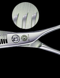 セニングはカッティングシザーと同様に「おがみ」「ひねり」「うらすき」に加え「調子あわせ」が大変重要になってきます。どんなに良い刃材であっても、これらの技術がひとつでも欠けると良いセニングはつくることができません。光邦シザーズのセニングは「ぬけ」が良く「シザーのごとくの切れ味」を目指し開発してきました。